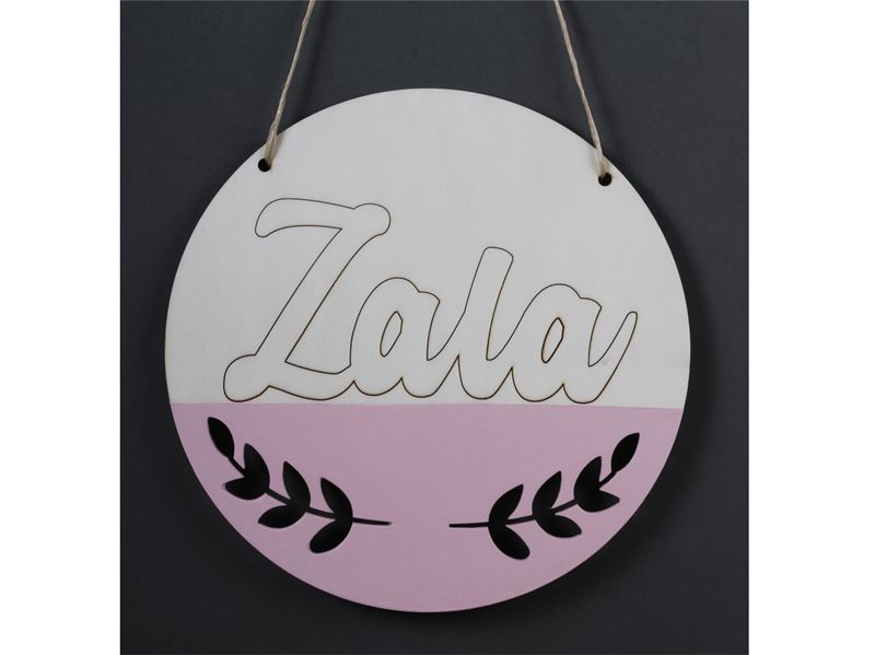 Okrogla lesena tabla z vgraviranim imenom s poljubno barvo pod besedilom. V prostor za besedilo dopišite željeno ime.